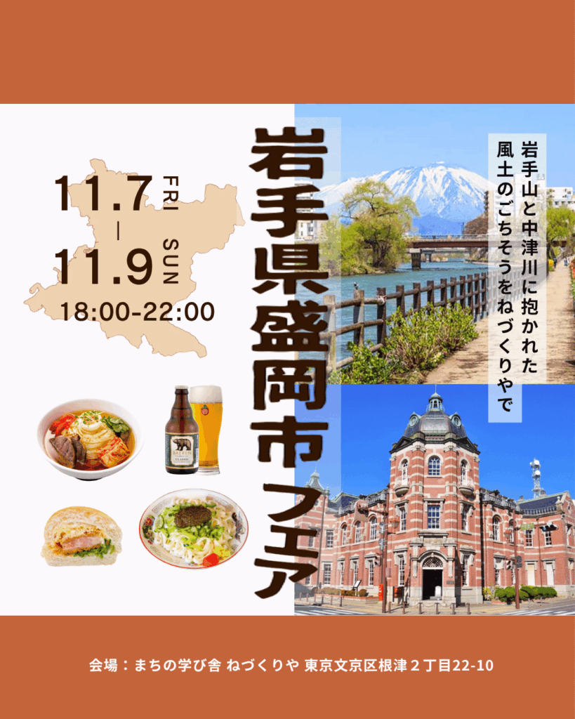 ねづくりやにて、岩手県盛岡市との地域連携イベント「盛岡市フェア」を2025年11月7日(金)〜11月9日(日)で開催いたします。